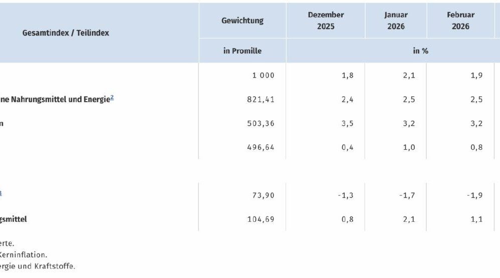 Према подацима Савезног завода за статистику, потрошачке цене су порасле за 1,1 одсто у поређењу са претходним месецом фебруаром 2026. године. Очекује се да ће основна инфлација – то јест, повећање цена искључујући веома нестабилне прехрамбене и енергетске секторе – достићи 2,5 одсто. Посебно је упечатљив раст цена енергије. Очекује се да ће оне бити 7,2 одсто веће у марту у поређењу са истим месецом прошле године. Ово је први међугодишњи пораст цена у енергетском сектору од децембра 2023. године.