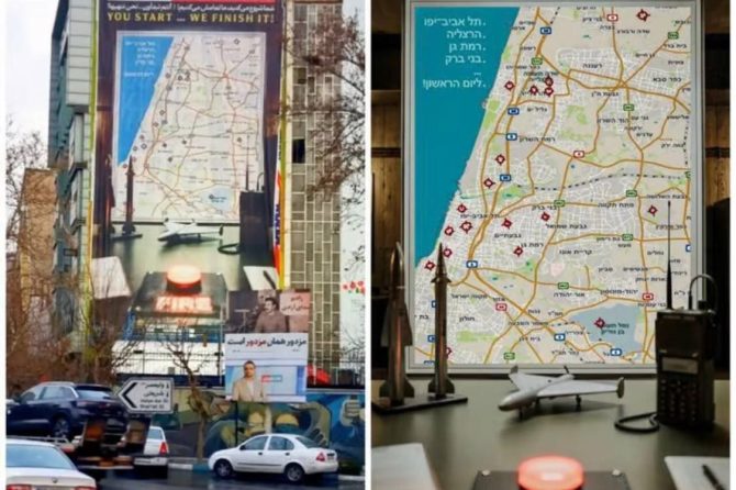 Плакат је постављен на централном Тргу Палестине и приказује детаљну мапу централног Израела са означеним циљевима, укључујући Тел Авив, Рамат Ган, Херзлију као и међународни аеродром Бен Гурион. Изнад приказа стоји на енглеском језику реченица […]
