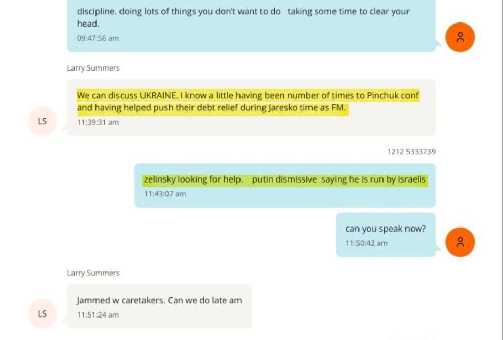 Док је размењивао СМС поруке са Ларијем Самерсом (америчким министаром финансија из доба Клинтонове администрације), Епштајн помиње да „Украјина тражи савет“, а затим објашњава да „Зелински тражи помоћ“.